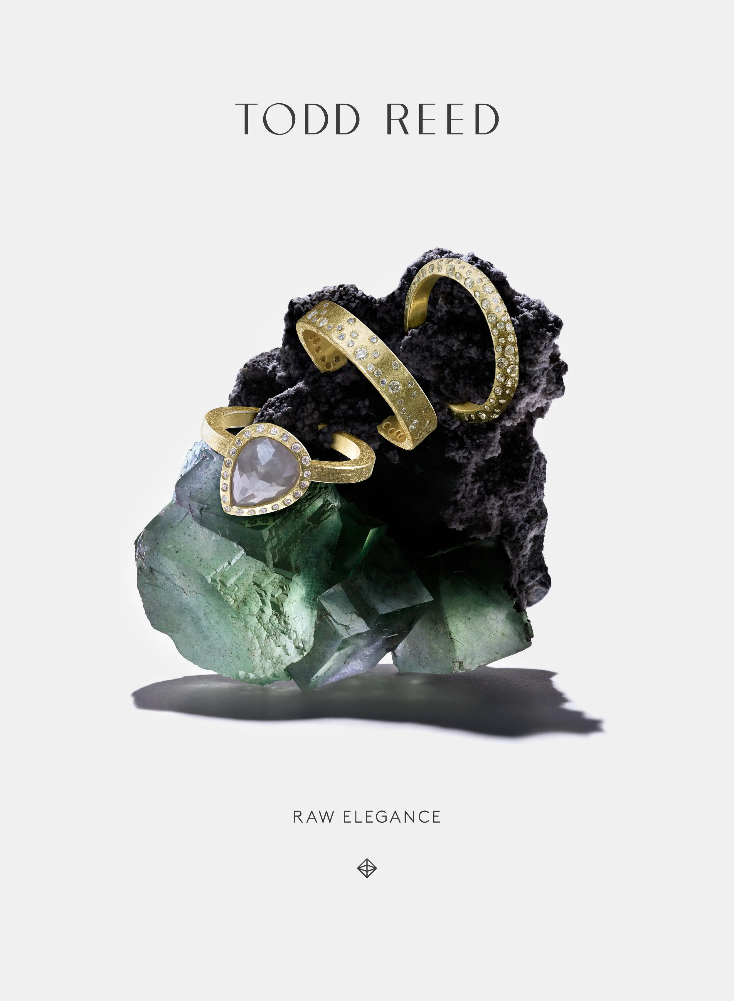 His work is hand-forged in his Boulder, Colorado studio, using the finest materials and ethically sourced, conflict-free stones. Todd’s jewelry adorns celebrities, royals, politicians and is collected worldwide. We were honored to develop branding, packaging, display, advertising, brand films and an e-commerce website for this talented artist. The jewelry is effectively a collaboration between Todd and the highly skilled artisans with whom he works. Rather than creating products along an assembly line, with each laborer doing only one specific task, Todd’s jewelers create each piece one at a time, by hand, from idea to final piece. This unique ongoing collaboration between Todd and his jewelers inspired us to create the Forged As One film. Tracking the journey from Todd’s original sketch to inspection and completion, this film is an homage to a truly artful process. To further honor this collaborative environment, we designed an engraving monogram signature for Todd as well as each of his 21 jewelers. After inspection approval, the jewelry is stamped both with Todd’s monogram and the artisan’s monogram, bringing the two signatures together, forged as one. An ever-changing creative powerhouse, Todd himself is inspired by nature, the turning of the seasons and the potency of the rugged landscape with which he’s surrounded. To speak to his personal process and creativity, we created a second brand film, showing Todd in his home environment, highlighting the evolution of his creativity, his love of the outdoors and his overall aesthetic. We also created advertising campaigns, this one depicting Todd’s jewelry emerging from crystals and rock formations, illustrative of the way in which his work cultivates a connection to, and an earnest honoring of, Nature.